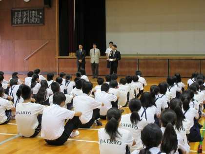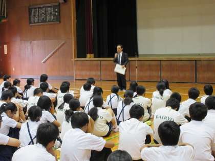 本日は本校のキャリア教育の一環として実施しています高等学校から来ていただいて高等学校の先生による授業を体験する取り組みを行いました。体験授業の前に体育館で各高等学校の先生から各校の学校の紹介をしていただきました。下の写真は、興国高等学校の紹介の様子、続いて城南学園高等学校の紹介の様子です。