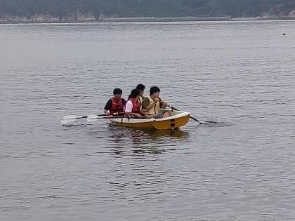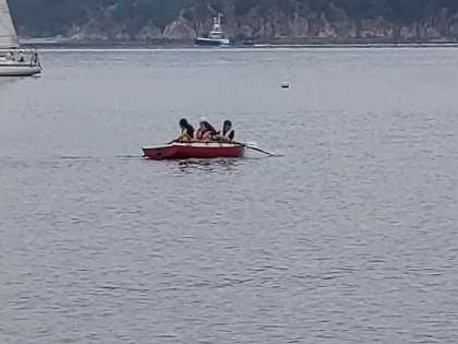 4人1組で漕いでいますが、それぞれの漕ぐ力の違いや穏やかとはいえ波もあり、意外に苦労しています。