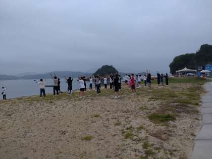 浜で行ったり、宿舎横の広いスペースで行ったり、とそれぞれですが、ラジオ体操をするなど身体を動かしたことですっきりして1日のスタートをきれることでしょう。