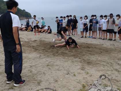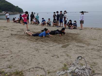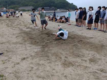 浜で、となればビーチフラッグ対決なのですが、より柔らかいビニールホースを使って行います。