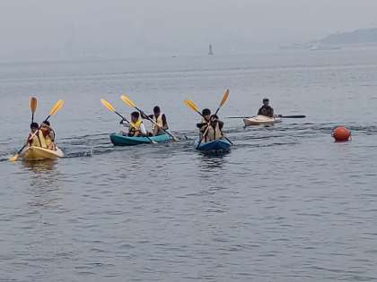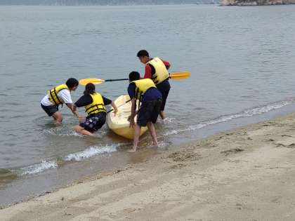 2人1組でカヤックを漕ぎます。2人のコンビネーションが勝負をわけます。