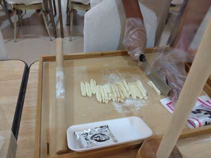 伸ばした生地をおりたたみ、めん切りをして、まずは各自のおみやげ分の完成です。