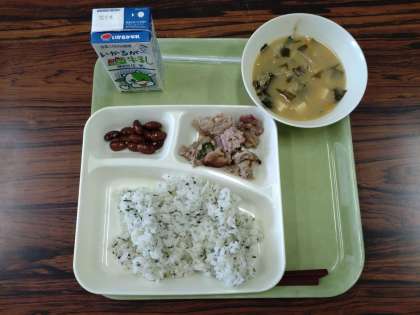 本日の給食の献立は、 豚肉の甘辛焼き 金時豆の煮もの みそ汁 菜飯 牛乳 です。