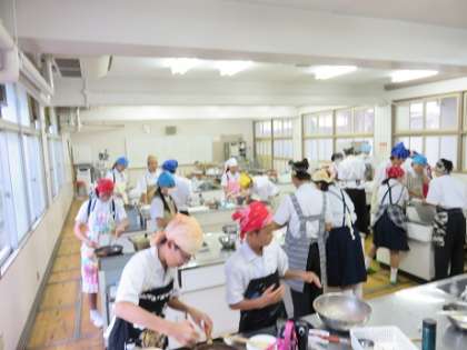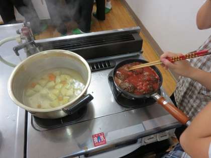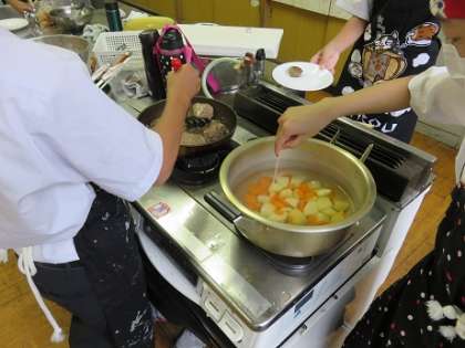 みんなチームワークよく一生懸命に取り組んでいました。さぼっている人は一人もいません。わからない時は、隣近所の調理台を見たり、先生の方を見たり、学習しようという意欲はいっぱいでした。そして、トマトソースも入りいよいよ仕上げに入っていきました。隣の鍋ではイモは柔らかくなっているか慎重にチェックしています。