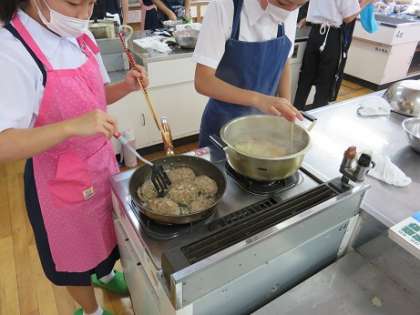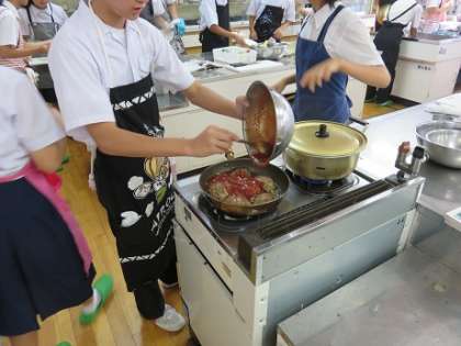 今週は2年生の各クラスが煮込みハンバーグの調理実習を順にしています。今日は2年2組の調理実習がありました。2時間の調理実習の後半を覗いてみました。今週月曜日の1組と同じくみんな熱心に取り組んでいました。