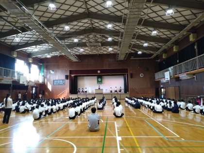 今日の6時間目、全校生徒が体育館に集合し、後期生徒会役員選挙の演説会が行われました。