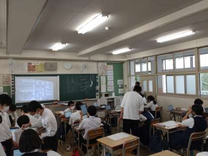 今日は平和学習の取組をさらに進めるため、1人1台学習者用端末を活用して調べ学習を行っています。