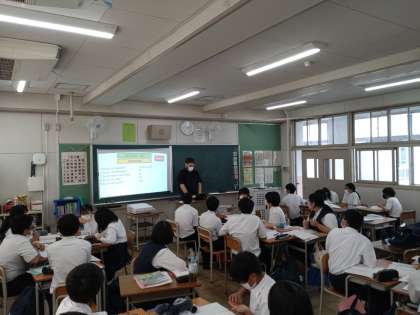 4時間目の1年2組、6時間目の1年1組の英語の時間は、C−NETのジェームス先生のもとで進んでいきました。