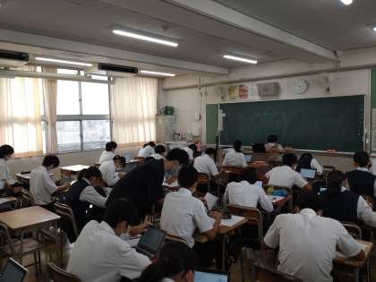 1人1台学習者用端末を通して解答したり、プリントに解答したり、と、さまざまな解答パターンがありましたが、中間テストが近いこともあり、全員真剣に取り組んでいました。