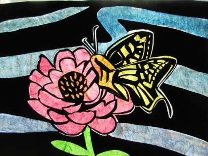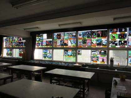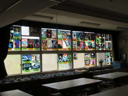 美術室南側の窓に2年生の『切り絵』の作品が掲示されています。紙でできていますが、ステンドグラスのように鑑賞できる作品です。外の明るい日差しをあびてとてもきれいです。また、個々の作品をよく見てみますと、とてもていねいで、個性豊かなデザインが目を引きます。