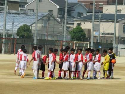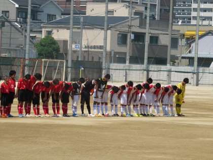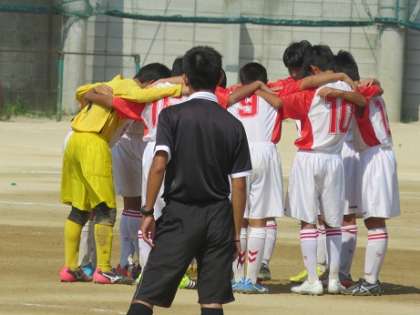サッカーブロック大会の第二戦は、本日、真住中学校と対戦しました。会場の三稜中学校には保護者の皆様も応援に駆け付けていただきました。始まりの様子です。