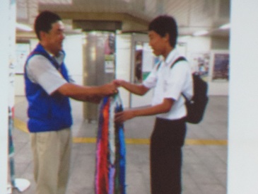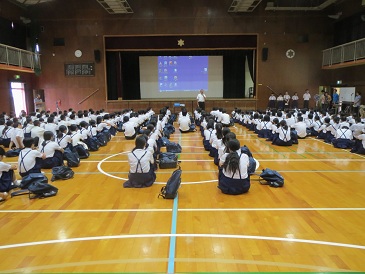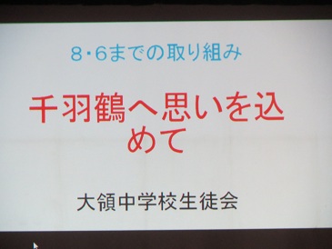 70年前の今日、8月6日に広島に原子爆弾が投下されて多くの人たちがその犠牲になりました。「戦争は絶対にしてはならない。」という思いを新たにするために毎年この日に平和登校日としての取り組みを行っています。今日は多くの生徒の皆さんが登校して、それぞれの学級で夏休みの今までの家庭での生活を振り返っていました。その後、体育館に移動して平和学習が始まりました。学校長のあいさつの後、生徒会のみなさんの今日までの取り組みの紹介がありました。千羽鶴に平和への思いを込めて、大阪市交通局が戦後70年を機に、お客様とともに平和の尊さを学び、千羽鶴で平和への願いをかたちづくる取り組みをしていることに合わせて、千羽鶴を制作して地下鉄難波駅に持参した時の様子が紹介されました。