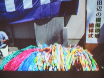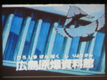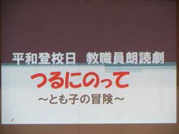 生徒会の取り組みとして東住吉区の田辺地域に投下された模擬爆弾による犠牲者の追悼式に参列したことが紹介されました。その後、教職員による朗読劇「つるにのって」〜とも子の冒険〜がありました。小学6年生の元気な少女とも子は、夏休みのある日、広島の原爆資料館を訪れました。とも子は、平和公園で不思議な少女と出会いました。彼女の名前はサダコ。そして、サダコの案内で、とも子の不思議な不思議な冒険が始まります。