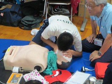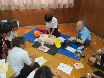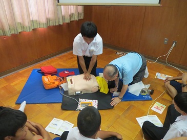 胸骨圧迫や人工呼吸など大切な技能の実習をとても真剣に取り組んでいました。さらに学校にも常備しているAEDの使用方法についても実習が行われました。緊急の場合には、地域の皆様も小学校や中学校に常備していますAEDを活用していただきますようお願いいたします。