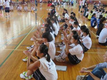 得点が入るたびに全員の歓声と拍手で精いっぱい応援していました。出場選手もお互いに励まし合いながら全力で戦っていました。結果は2対1の惜敗でした。よく頑張りました。