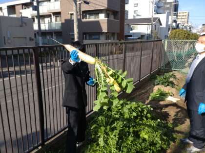 まずは園芸作業で育てていたダイコンとホウレンソウの収穫を行いました。雑草を抜き、ダイコンを収穫しましたが、それはそれは立派なサイズでした。
