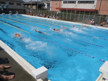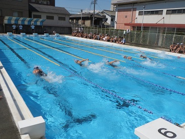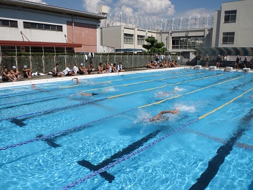 本日から順次学年別に水泳大会が開催されます。本日は3年生が中学校生活で最後の水泳大会を実施しました。体育館で開会式を行い、プールでそれぞれの種目で競技を行いました。競技に参加している生徒も応援している生徒も競技に集中してとても盛り上がった大会でした。明日は2年生が31日には1年生が水泳大会を行います。