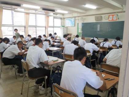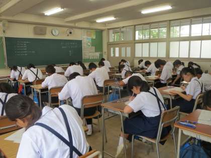 今日は1・2年で課題テストが実施されました。写真は2年生の様子です。みんな真剣にテストに取り組んでいました。なお、今週の月曜日に実施する予定でした1年生水泳大会は、雨天のため4日(金)の午後に延期しました。また、明日3日(木)は、中学校教育研究会の7ブロック研究発表会が午後実施されるため授業は午前中に45分で4時間となります。ご了解ください。