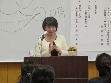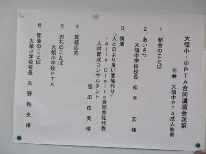 9月11日(金曜日)の午後3時より大領中学校の多目的室において人材育成コンサルタントの脇田由美様をお迎えして『人とのより良い関係作り』という演題で講演会を開催しました。大領小学校・中学校の保護者・教職員の皆様に多数お集まりいただきました。「より良い関係を築くポイントは第一印象」「相手を認めよう・ほめよう」「認め上手・ほめ上手になるには」「ブラスストロークで思いを伝える」など人とのより良い関係作りの極意をさわやかな笑顔と見事なトークで、和やかな雰囲気の中でしっかりと皆さんに伝えていただきました。参加していただいた皆様から「とてもよい講演会でした。」とか「とても参考になりました。」などお褒めの言葉をいただきました。脇田由美先生ありがとうございました。後日講演会のレジメをアップしますので、参加されなかった皆様もご覧ください。よろしくお願いします。