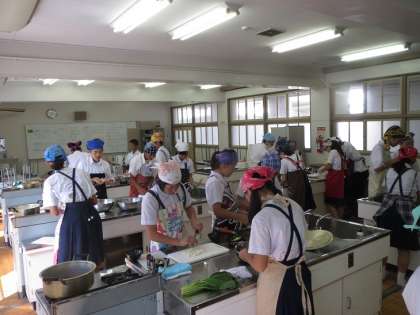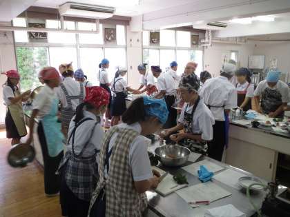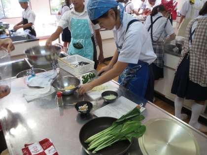 本日は2年1組の調理実習でした。メニューは「鮭のムニエル・タルタルソース添え」と「小松菜のバターソース炒め」です。もともとカレイの煮付けを作る予定でしたが、子どもたちから「ムニエル作りたーい!」という強い要望があり、秋鮭ですので、「生秋鮭」を使ったムニエルにしました。単に小麦粉をはたくだけのムニエルですが、美味しく作るポイントや美しく仕上げるポイントはあります。子どもたちは先生からのアドバイスをプリントに書き込み、それはそれは美しく焼き上げていました。みじん切りの多いメニューでしたが、どの班も「みじん切り」がスピーディーですばらしかったです。