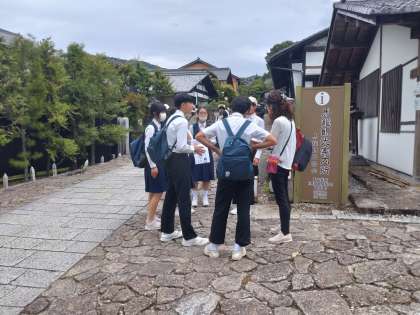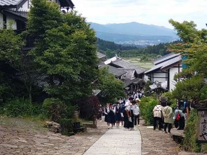 馬籠宿は坂道になっており、生徒のみなさんはまず下からあがってきています。