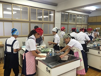 16日は2年2組の調理実習がありました。献立は「生秋鮭のムニエル・タルタルソース添え」と「小松菜のバター醤油ソテー」です。今日の秋鮭も美味しそうなものが手に入り、よかったです。今日の目標は鮭を焦がさずに焼くことと、段取りよくスムーズに動くことです。調理を始める前に全体に指導します。作り方はもちろんのこと、「なぜ魚に塩を振ってから時間をおくのか」や「魚のソテーを皮面からする理由」など、卒業してからも使える情報も同時に伝えていきます。実習当初はボーッと聞き流すだけだった生徒も、今では鉛筆を持って必要なことをどんどん書き込んでいってくれる姿が見られるようになってきました!そうすると、失敗も少なくなってきた上、指示が無くても動ける生徒がふえてきたように思います。調理実習で班の人と協力することに慣れてきたようです。なかなか余裕がなく、硬かった表情の人もいましたが、だんだんと余裕の笑顔も見られるようになってきました。