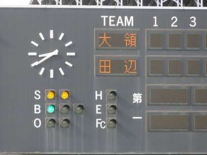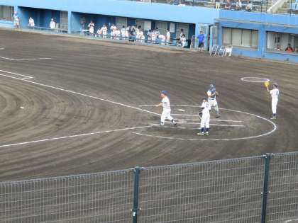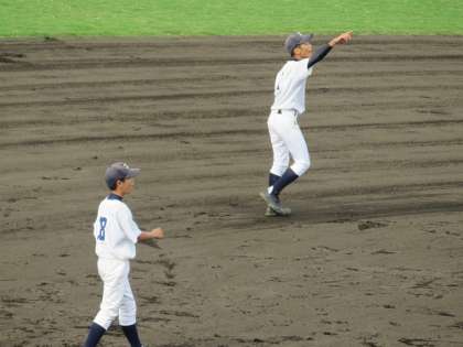 いよいよ舞洲ベースボールスタジアムに大領中学校野球部がやってきました。心配された天候も味方してくれて、本格的な野球場での試合に臨みました。試合前のノックの様子です。後は勝利の女神が微笑んでくれることを祈るばかりでした。