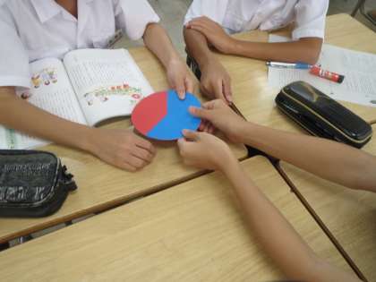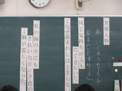 本日は1年3組で6時間目に校内での道徳の教職員研修として道徳の研究授業を実施しました。『私もいじめた一人なのに・・・』という読み物教材を用いて、ある小学校で一人の女の子がいじめられるという読み物のなかで、その「いじめ」を止められないでいる私の心情と、いじめられている女の子の心情の変化を各班で心情円板を用いてポジティブ(肯定的)な心情(赤)とネガティブ(否定的)な心情(青)の推移を話し合わせて「自分自身の正しさに自信をもつこと」や「それらを推し進め、行動に移すこと」の強い気持を養うというねらいの授業です。研究授業の後で、図書室で教育委員会から指導助言にお出でいただした先生を囲んで研究協議を行いました。今後、道徳の時間が数年後には教科化されることに伴い昨年度より本校でも道徳の授業の教職員研修に本格的に取り組んでいます。教科の学習だけでなく、子どもたちが道徳的にも優れた人間に成長くれるよう願っています。