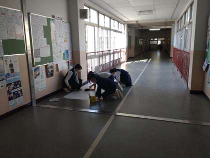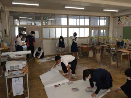 劇を披露する3年生が背景などの作成に取り掛かっています。