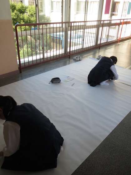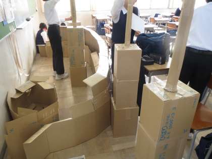 2年生の舞台練習の様子を中庭から覗きました。みんな先生の指示で真剣に練習していました。廊下では舞台の背景の制作に取り組んでいました。また、別な教室を覗くとざら紙の空箱を活用して何やら怪しいものを制作していました。みんな日常の生活を離れて、頭の中は、空想の世界に飛躍しているのかもしれません。文化祭が終わったら日常の世界に戻ってこれるでしょうか。