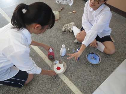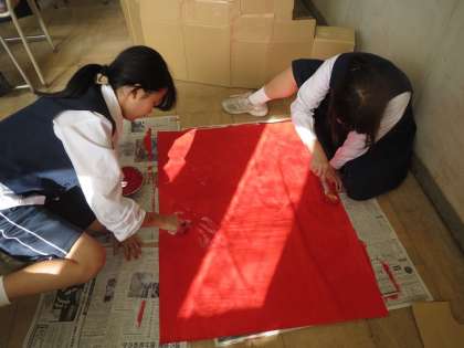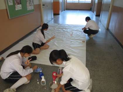 廊下では舞台関係の背景のような作品が続々と作られていました。白い絵の具の真ん中に赤い絵の具を落として「これ日の丸?」なんて言いながら楽しんでいました。