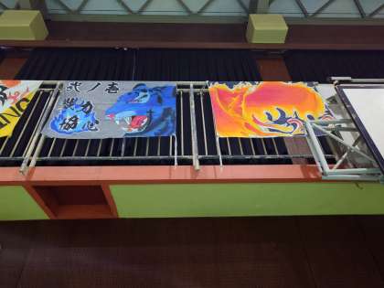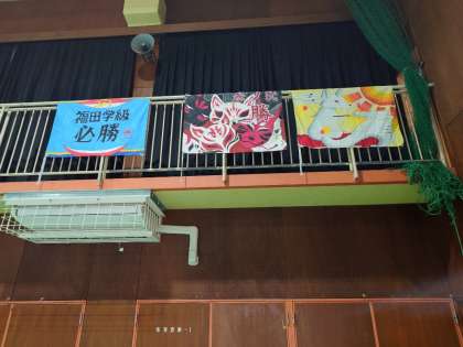 1学期の体育大会で作成した各クラスの学級旗が体育館内に掲示されていました。