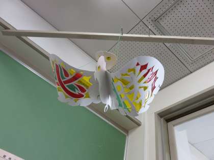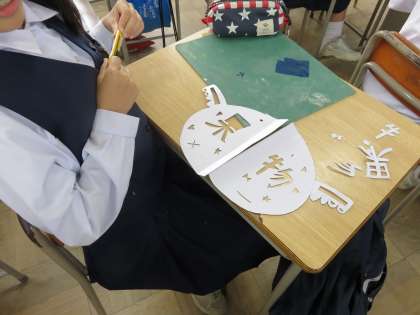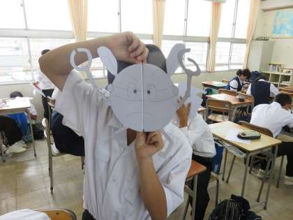 教室を覗くと、何やら面のようなものを制作していました。(果物)とか(必勝)などいろいろデザインされています。どのように文化祭に登場するのか楽しみです。