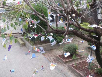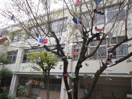 1年は中庭の桜の木にモビール(鳥の模型)をたくさん吊るしていました。全体の様子とそれぞれの作品をいくつかアップしました。制作した生徒の思いがこもっています。