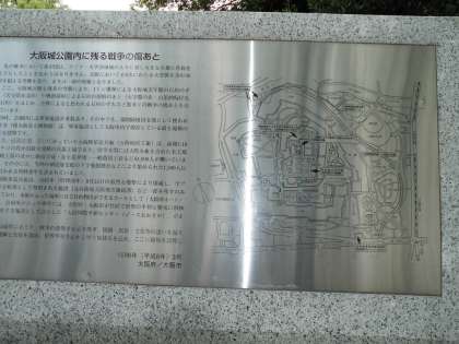 写真は「大阪城公園内に残る戦争の傷跡」という表示とかつての大阪陸軍兵器支廠の本部門です。ここで兵器・弾薬・器材などの補給や要塞の工事を担当しました。