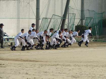 野球部の7ブロック秋季大会の準決勝戦が11月3日(火)に墨江丘中学校で開催されました。対戦相手は西成区の成南中学校です。夏の大会でも大阪市で3位と健闘している野球部はその後も顧問の指導のもとにしっかりと練習に励んできました。ブロック大会でも準決勝に進出してこの日を迎えました。試合開始の様子です。
