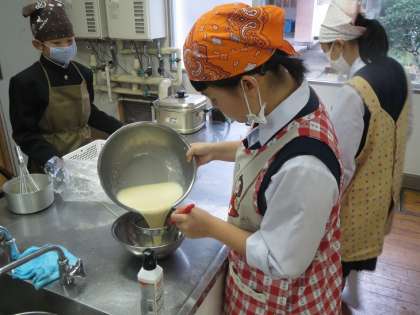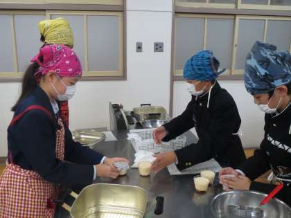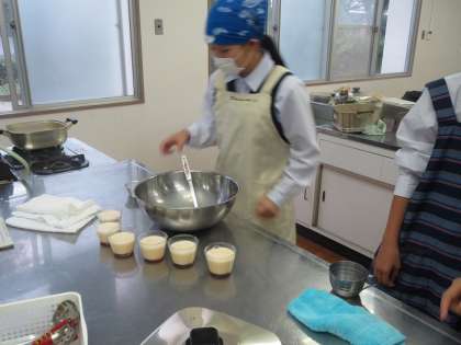 教職員がお互いの授業を参観して批評し合いお互いの授業力を高めようという取り組みです。今年は大領小学校からも7名の先生が研修のためにこの取り組みに参加していただきます。1年3組は2〜3時間目にプリンを作る調理実習がありました。その様子を参観させていただきました。