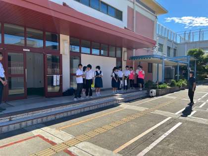 【9月10日火曜日】 青空の中、朝のあいさつ運動です。