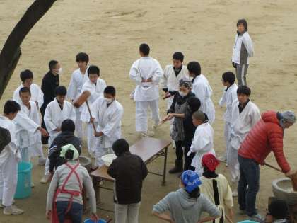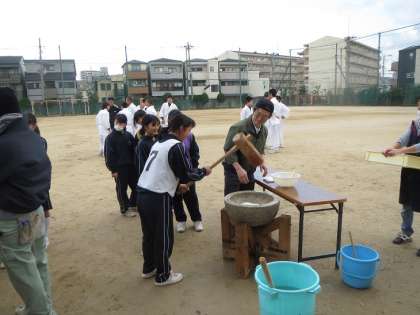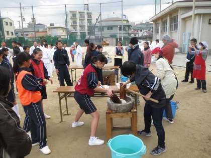 12月4日(金)本日、恒例のPTA行事大領祭が開催されました。朝早くからPTA保護者の皆さんに準備をしていただき、グランドでは生徒・地域のみなさん・保護者の皆さんの総出で餅つきを午前9時過ぎから始めました。今日は強い風の一日でした。またとても寒い中、懸命に餅をついていました。寒い中でも、笑顔があふれ、みんな心を一つに楽しんでいました。