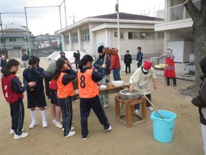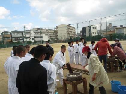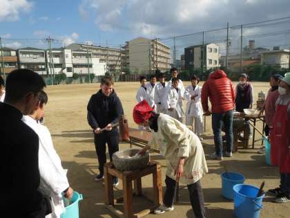 体育の授業中の生徒の皆さんも、授業を一休みして餅つきに参加してくれました。C-NETのギャビン先生も昨年に続いて餅つき体験をしていただきました。