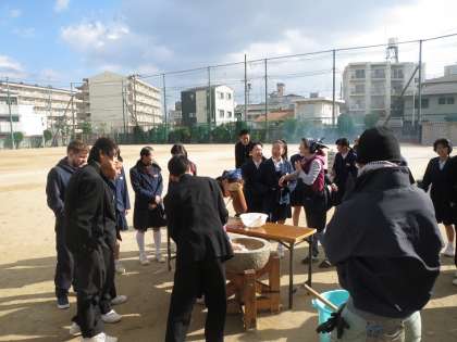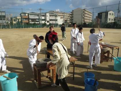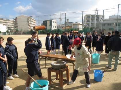 体育の授業中の生徒ともに、教室で勉強していた生徒も餅つきに参加してくれました。とても一生懸命でした。協力ありがとうございます。