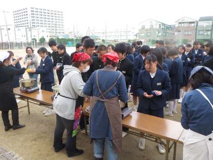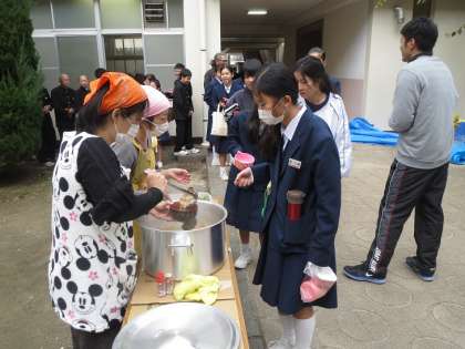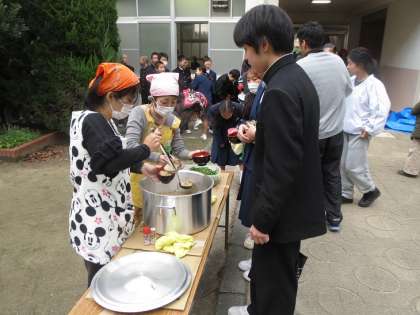 今年は、2・3年は2階の各教室で、1年生は1階の木工室・学習室・美術室でクラスごとに分かれてお餅と豚汁をいただきました。このため1年生はまず豚汁を中庭でお椀に保護者のみなさんについでいただきました。お餅は、2・3年生の後でグランドでタッパーに入れていただきました。