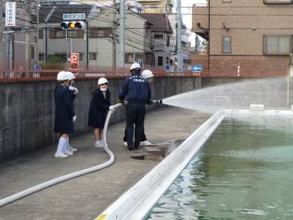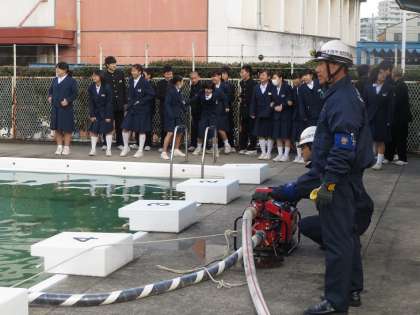 2時間目から住吉消防署と住吉区役所地域課のみなさんの協力で、防災訓練を実施しました。この模様は授業参観として保護者の皆様にもご覧いただきました。プールでの可搬式ポンプによる消火訓練の様子です。