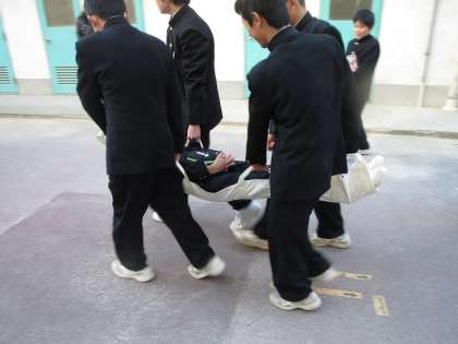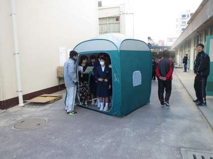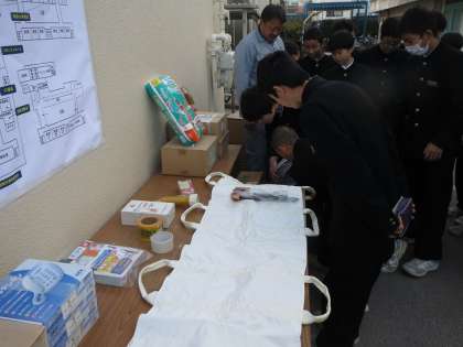 住吉区役所の地域課の職員の方が、大領中学校の体育館の倉庫に保管している救助資材の取り扱い要領や備蓄資材についてわかりやすく、体験も交えて生徒に説明してくれました。簡易タンカーやテントなどいろいろな救急資材が保管されています。