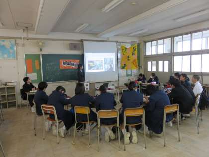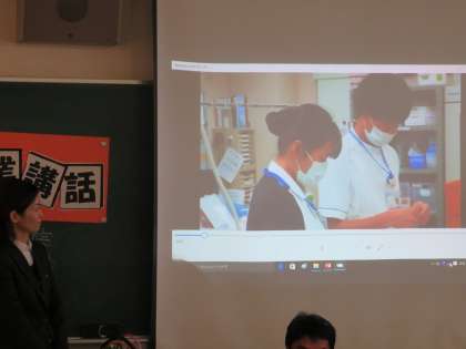 1年生では毎年キャリア教育の一環としてさまざまな職業の方にお出でいただいて職業講話を実施しています。今日は6名のさまざまな職業についておられる方にお出でいただいてご自分の職業について講話をしていただきました。最初に紹介しますのは、校区内にあります大阪府立急性期・総合医療センターからお出でいただいた看護師の方です。看護師としての一日の仕事やこの仕事に就こうとした動機、やりがい、また、大きな病院に勤務されている多くの医師・看護師・職員のみなさんがどのように仕事をされているのかなどについてわかりやすくていねいにご説明いただきました。生徒の中にも将来看護師になりたいと考えている者もいました。今日のお話を聞いてさらにその思いをふくらませてくれたらうれしいと思います。お忙しいところお出でいただきましてありがとうございました。