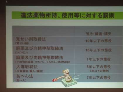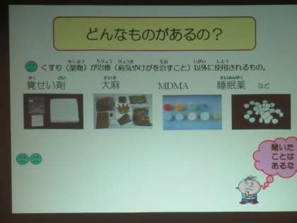 麻薬や違法な薬物を乱用することで人体にどれほどの悪影響があるのか、また、違法薬物を所持したり使用することでどれほどの罰則が適用されるのか、いろいろと詳しくお話をしていただきました。一番気を付けなければならないことは、薬物を乱用すると身体が破壊されてしまって、最悪の場合は死に至るという危険があること。生きていても廃人になる恐れがあるということです。