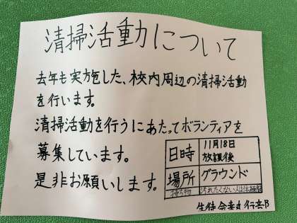生徒会が声かけをしてくれボランティアの清掃活動が行われます。 みなさん協力しましょう!!