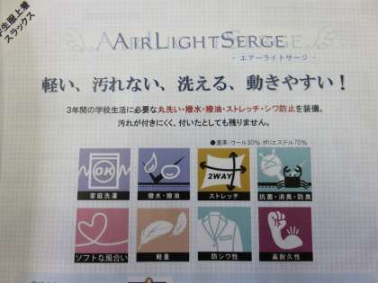 成長に合わせて胸周りを広げることができます。またズボンのウエストが広がります。その他、撥水・撥油などさまざまな機能があります。学校創立以来37年間同じ標準服でした。その間に標準服もずいぶん進化していました。しかし、基本のデザインは従来のものを踏襲しています。