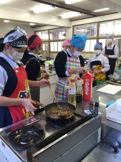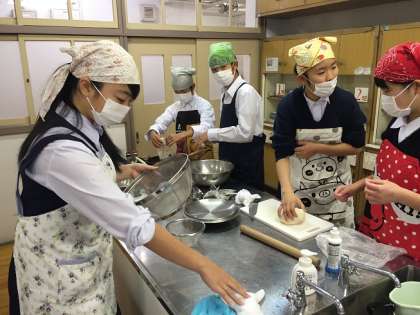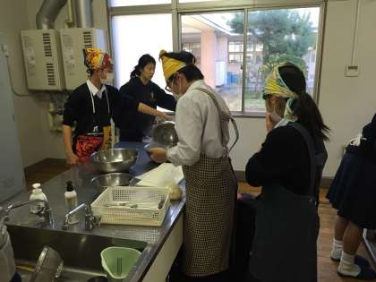 作り始めると、キャーキャー言いながら持参の新聞紙の上に袋を置き、ひたすらフミフミ・・・踏んでいる間に他の人はどんぶりを用意したり、昆布とカツオの合わせだしを用意。教室中に昆布の良い香りが漂うと、「おいしそう〜」カツオの良い香りが合わさると「ヤバイ!」「お腹すいてきた」と声が上がります。最後には自分の好みで、ネギ、とろろ昆布、梅干し、ワカメをのせます。トッピングで一番のおススメはその場でせっせと教師が作った「天かす」です。中には大量に振りかけていた人もいました。