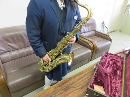 大阪市から中古楽器を希望する中学校に譲るという申し出が過日ありました。楽器の数や種類に限りがあるため希望する中学校が集まって、公平に抽選を行って楽器をどの学校に譲るか決めるということになりました。本校は幸運にも希望していたテナーサックスを射止めることができました。中古とはいえ現物を購入することは学校の予算では到底無理と思えるとても高価な楽器です。ケースから出して生徒に実際に触れて、演奏してもらいましたが、とても迫力のある美しい音が出ると感動していました。大変にありがたいことです。吹奏楽部のみなさんにはこれまで以上に頑張ってもらいたいと思います。また4月に入学する新入生の中からも多くの生徒が吹奏楽部に入部してくれることを期待しています。よろしくお願いします。